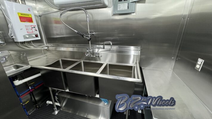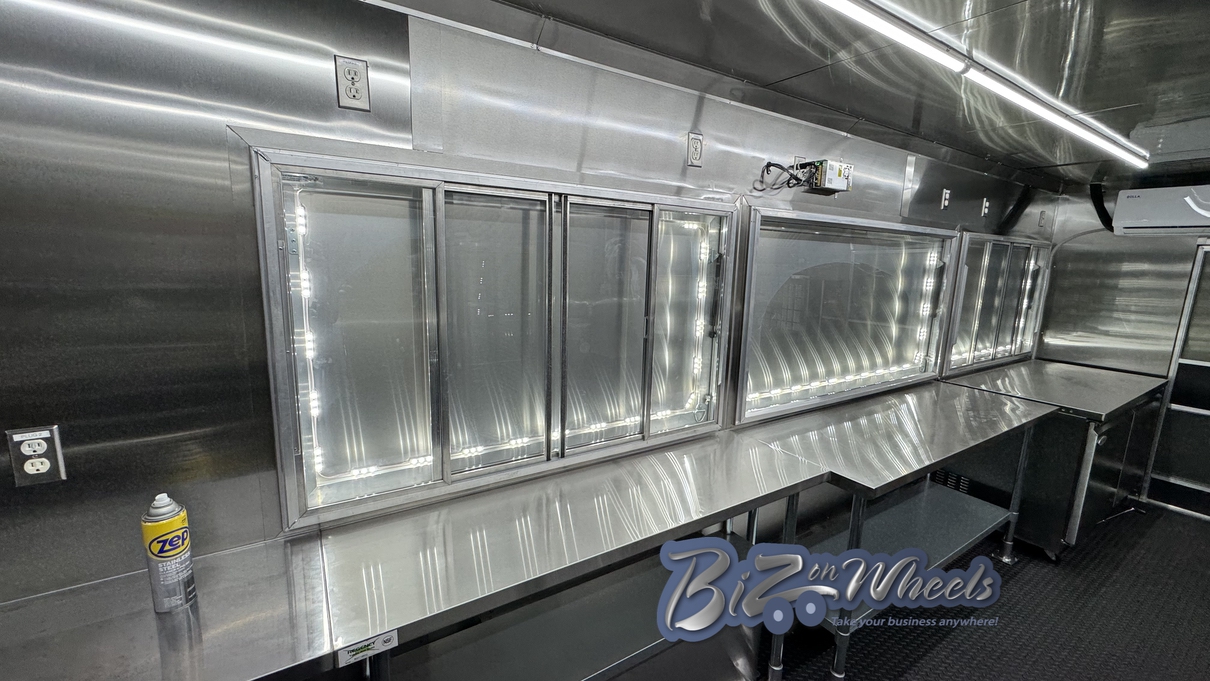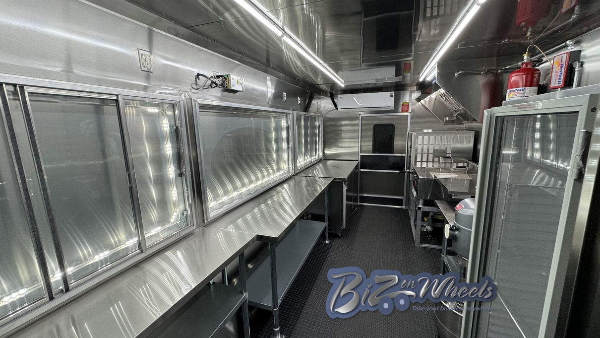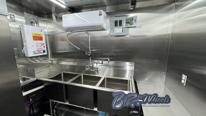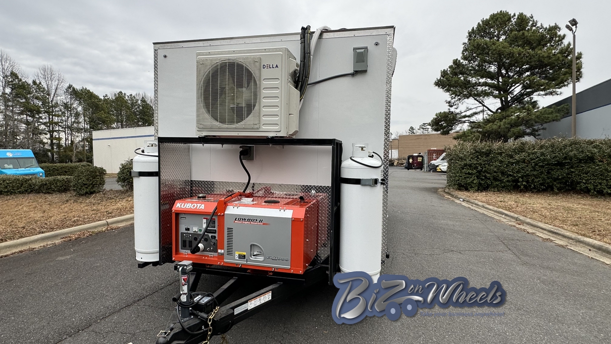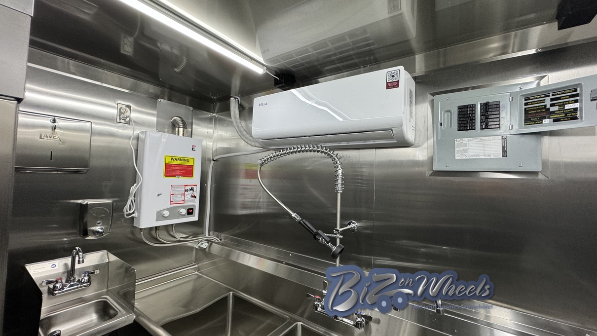 For interior comfort and temperature stability, the trailer is equipped with a mini split air conditioning system rated at 27,000 BTU with two independent zones. This dual-zone setup ensures consistent cooling across production and service areas, protecting ingredients, equipment, and staff comfort during extended operating hours.