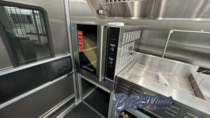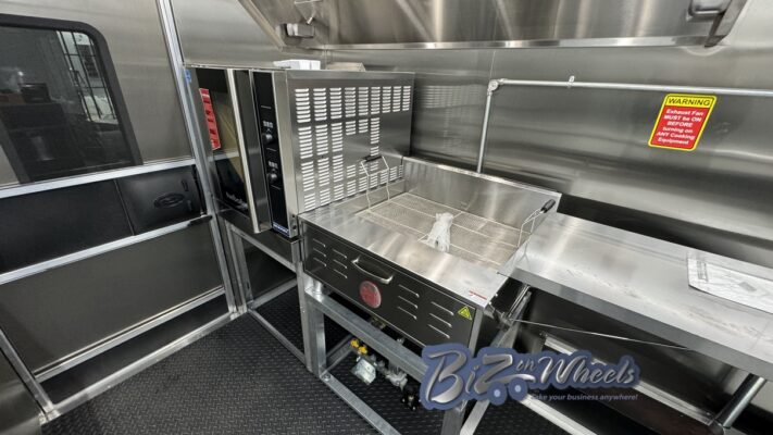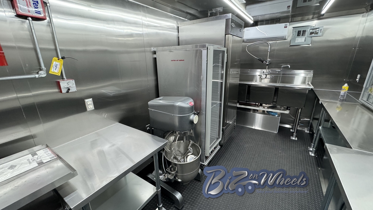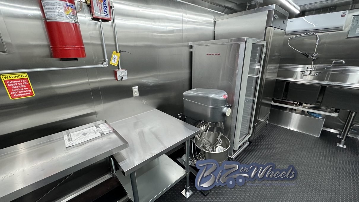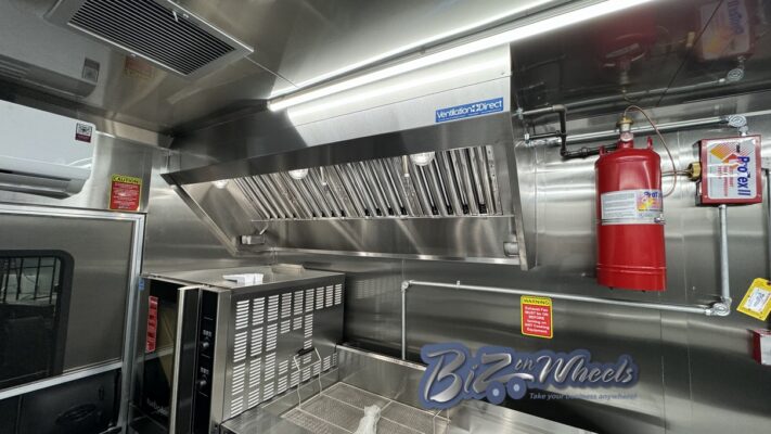 The trailer is equipped with a stainless steel hood system with an exhaust fan and make-up air, designed to properly manage heat, steam, and odors generated by bakery and donut equipment. This ventilation system supports safe operation and compliance with health and fire codes.